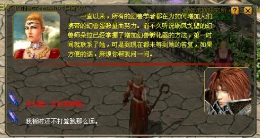 1。在雷鸣交易行中与奈奈安对话,了解到朵拉已经掌握了增加幻兽孵化器孵化位的技术。但由于一直没有收到朵拉的说明,奈奈安只好拜托你亲自去见一下朵拉。