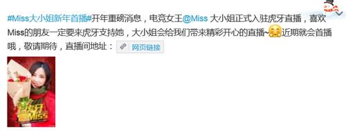 春节假期刚结束,直播平台传来了今年首个重磅消息:电竞第一女神韩懿莹(Miss)正式签约虎牙直播!昨晚,虎牙直播官方微博宣布Miss正式入驻。年前Miss曾发微博称“今年的直播到这里结束啦,明年见,至于在哪个平台什么时候开始直播,大家关注我的微博微信和视频哟”。粉丝们纷纷猜测Miss去向,现Miss签约虎牙已经证实,让我们期待猴年Miss在虎牙新平台大展身手,为玩家观众们提供更多更优秀的直播内容。