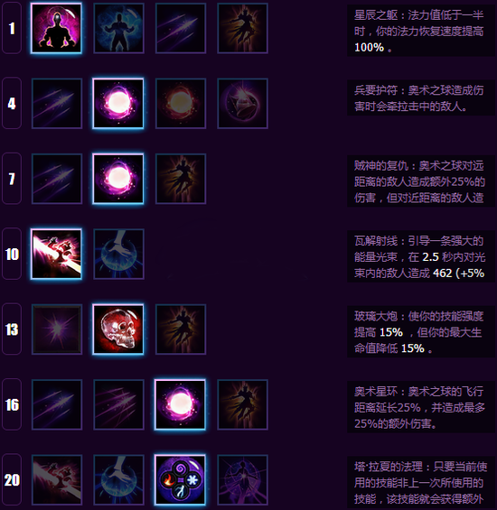 李敏天赋概述:主奥术之球的远程POKE型天赋;1级星辰之躯加强续航能力,4级兵要护符用来控制和打断施法,7、16点出奥术之球的伤害和射程,后期有塔拉夏加成的奥术之球远端伤害可高达1300+!
