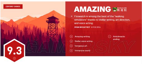 看火人这款游戏有许多原因让我觉得很棒,不过最重要的是游戏中许多比较严肃的事件以及就像现实之中的对话说明这款游戏可能更适合于成年人进行游玩。另外游戏与现实中解决一些问题的方式一模一样,有时可能是幽默的,有时是愤怒的,也有些时候是悲伤的。游戏在第一人称叙事游戏中属于顶尖水平,它也提醒了我们只有在对的人手里,叙事类的游戏才会这么棒。也许一年后或是两年后,我还会打开这款游戏,只是为了其中美丽的风景以及令人难忘的角色,就像读一本好书一样。