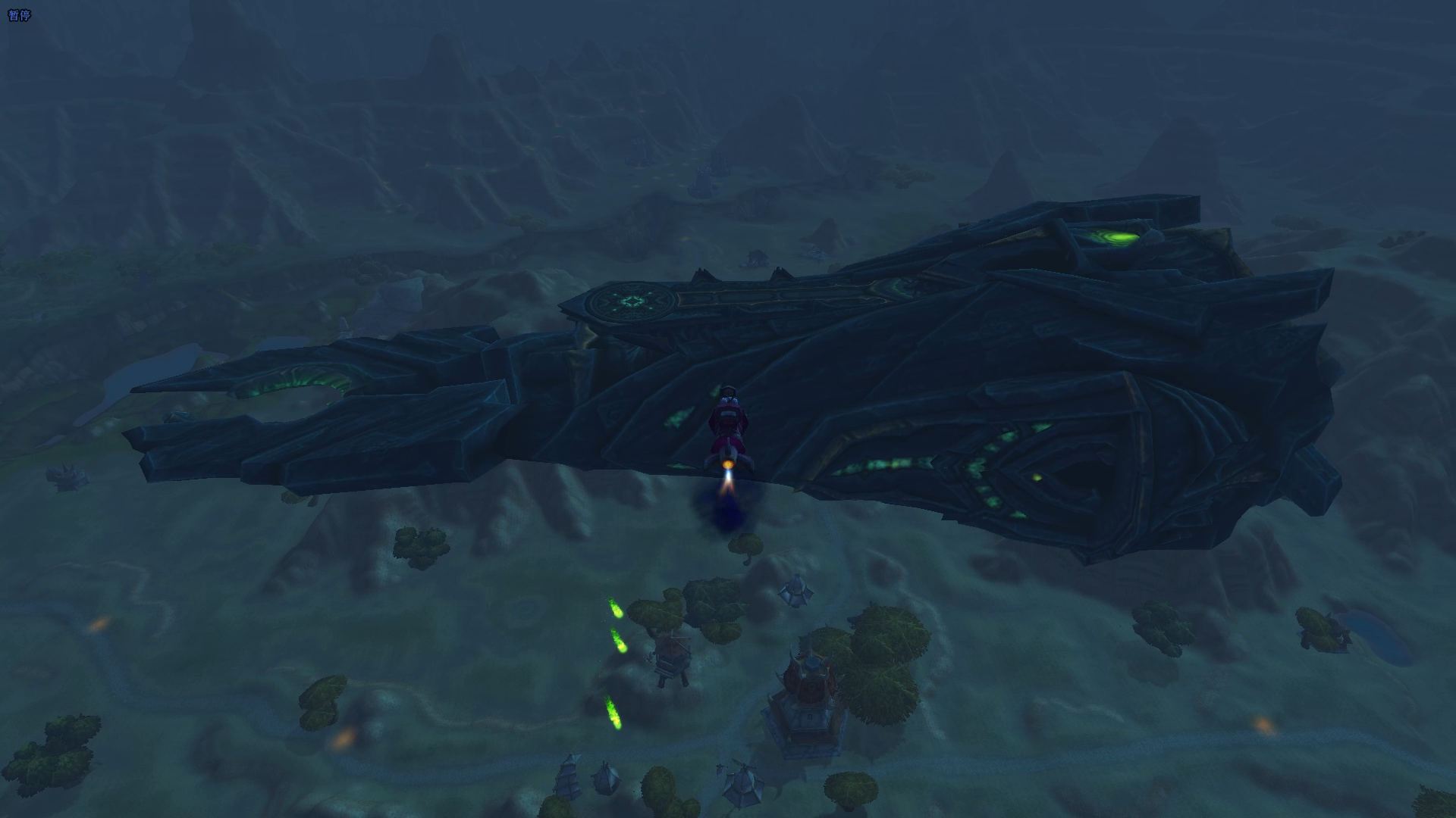 由于测试服的bug,实际上只看到一艘航母在天上丢炸弹,并没有看到很多军团怪物入侵。只是在不远处的一个小山包上,断断续续的刷新了几只地狱火。