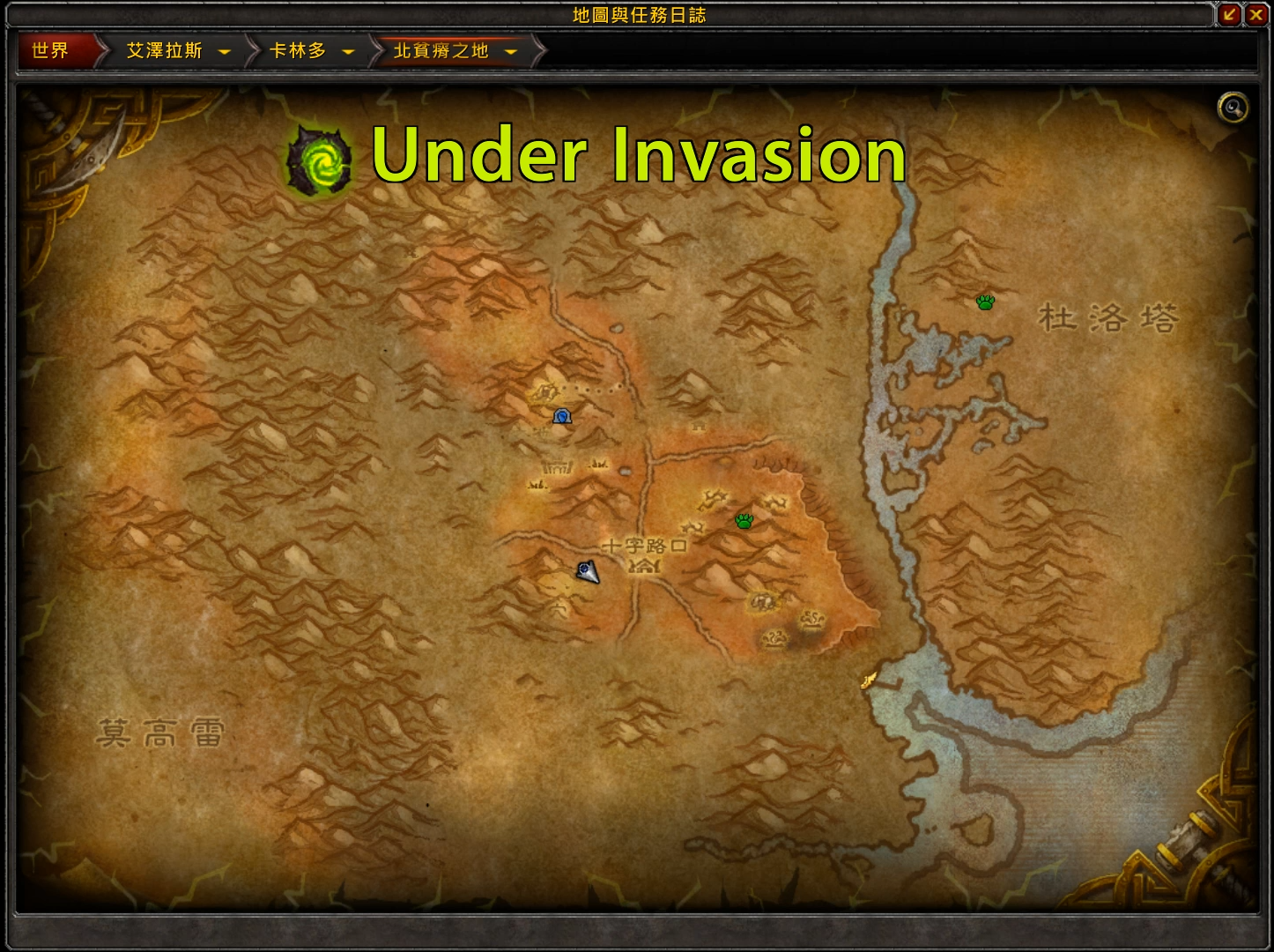 当有燃烧军团入侵的时候,可以在地图上看到明显的标记和剩余时间,这次入侵事件发生在北贫瘠之地,剩余时间1小时49分钟。