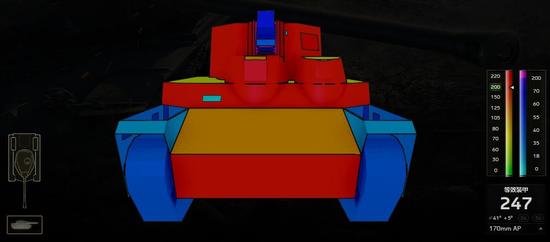 后脑勺,以及后面的小书包(小炮塔)同样是200mm,车体依旧是150,想后入的轻坦一定有不少,但是先看看穿深再说,比如T71啊、斗牛汪啊之类的,先看看穿深够不够,再去想要不要打。