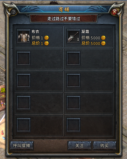 1、点击摊位,打开卖家的物品出售界面,选择看中的物品,点击“购买”按钮,完成购买。