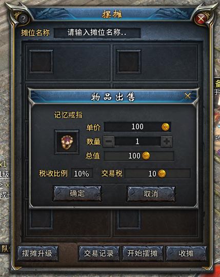 2、右键点击需要卖出的物品,或鼠标拖动需要卖出的物品到“摆摊”界面,在弹出的物品信息界面设定好数量和价格,点击“确定”完成设定。