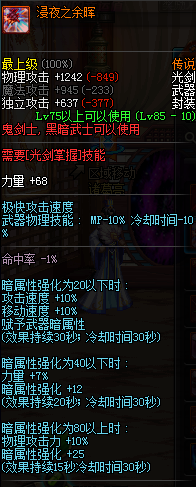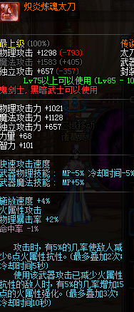 实际属性是进图后每5秒(还是2秒)增加1点火强,最多20点,火强在100以上的时,增加20%爆击伤害,还算不错的太刀。