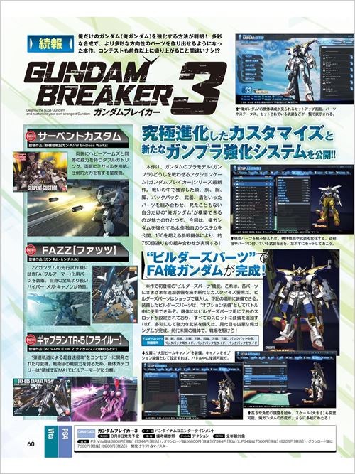 即将在3月3日发售的PS4/PSV游戏《高达破坏者3》详细公开了本作的零件强化系统,和过往作品一样,玩家可以在这次游戏里自由组建钢普拉的头、手、胴、脚、背部与武装,来搭建属于自己的特色钢普拉模型。尤其是在这次游戏中,有超过150款参战机体,直接令本作游戏组合钢普拉的方式,超过了750亿种。
