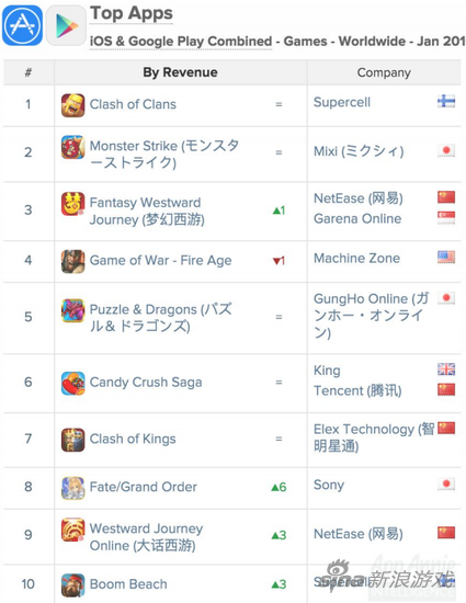 1月份,动漫风格的RPG卡牌游戏 《Fate/Grand Order》 尽管只在日本上市,但仍然跻身iOS和Google Play全球收入排行榜。该游戏是 Fate系列游戏的一部分,系列作品包括漫画、动漫和改编电子游戏。该系列游戏拥有一大批追随者,这可能助长了《Fate/Grand Order》的极高人气。