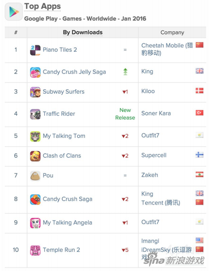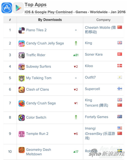 1月初在全球发布的《糖果果冻传奇 (Candy Crush Jelly Saga)》 在iOS和Google Play全球综合下载量排行榜上跃升至第2位。