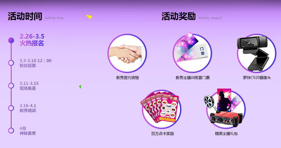 前50名且完成新秀培训并签约的主播将获得罗技C920摄像头一个,活动中获得前3名的主播,还将额外获得艾肯声卡ICON Utrack套装一套,和参与线下顶尖主播训练营资格。所有活动签约主播在完成首秀后,还将获得价值4W元宝的点卡奖励!