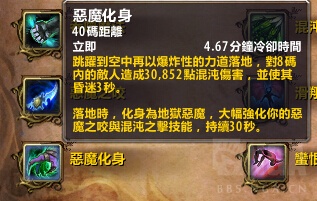 长达5分钟的爆发技能,DH标志性的大招变恶魔。可惜的是并没有war3里面的那样变成远程输出(实际上DH在设计阶段确实有一个远程DPS的第三天赋,但是因为不符合DH的形象而被彻底取消)。