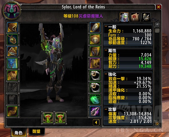 此为108级的数据,目前测试服等级上限为108级。装备为了练级考虑全都是装等优先,实际raid中属性肯定会大有不同,仅供参考。