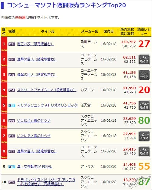 本周日本MC销量,榜首全部为新作也颇为喜人,能有这么多好游戏最开心的当然是诸位玩家老爷。舰娘14W销量颇让人有些意外,巨人三版本分别位居第二第三和第八位,合计15万的销量其实已经盖过舰娘。街霸5首周销量4万的势头不是很好。看看老游戏,DQ建造者已经合计26万的销量的成绩估计让SE乐开了花,章鱼娘发售半年有余的如今依旧能月出1万左右也是可怕,位居14,15的是两个老任的销量怪兽:妖表和怪猎X。