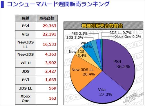 硬件方面PS4排名第一,销量为2.9万,第二位是小V2.2万,新3DSLL位居第三位1.6万台。