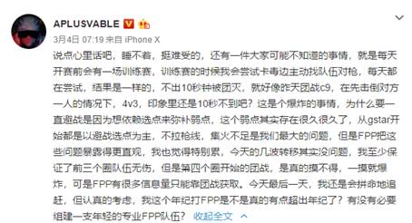 在经历了Sli联赛前三个比赛日的低谷后,A+发布了一条长微博,结尾这样写道:“我这个年纪打FPP是不是真的有点超出年纪了?” A+内心的迷惘,所有一路追随的粉丝都是感同身受,甚至有粉丝开始担心起A+的心态,担心A+是否要选择退役了。