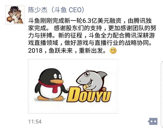恰逢两会期间,直播行业再传重大融资消息。3月8日,有报道称,作为行业的领头羊,斗鱼再次完成E轮融资,融资额为40亿元人民币,随后斗鱼创始人兼CEO陈少杰在朋友群里证实了这一消息,至此,斗鱼成为整个行业最先完成E轮融资的企业,带领全行业稳步前行。