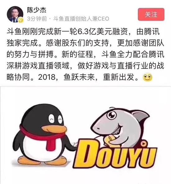 昨天上午11点54分,斗鱼CEO陈少杰发朋友圈确认这一消息。他表示,斗鱼刚完成6.3亿美元融资,腾讯独家。同时,他提到斗鱼将配合腾讯深耕游戏直播领域,做好游戏与直播行业的战略协同。