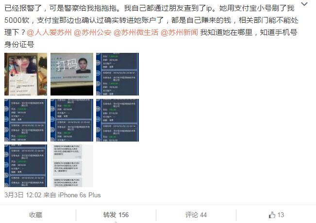 因担心无法找回自己的钱,而且这个钱是男方准备用来给现在的未婚妻买钻戒用的,未婚妻发了微博放出证据并联络到了苏州公安。