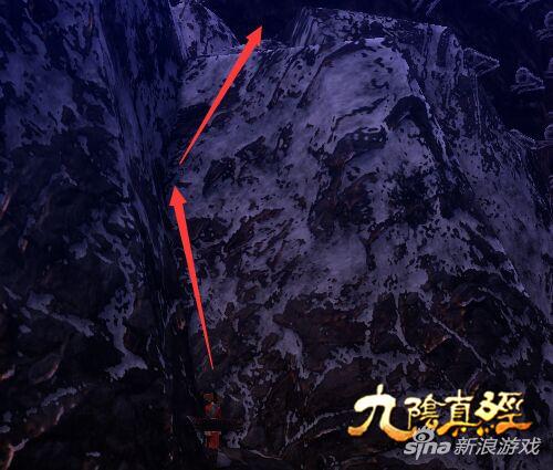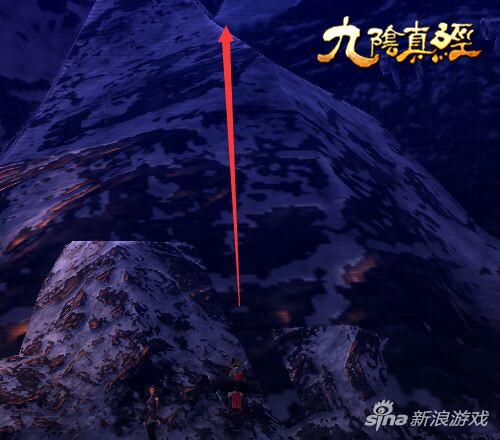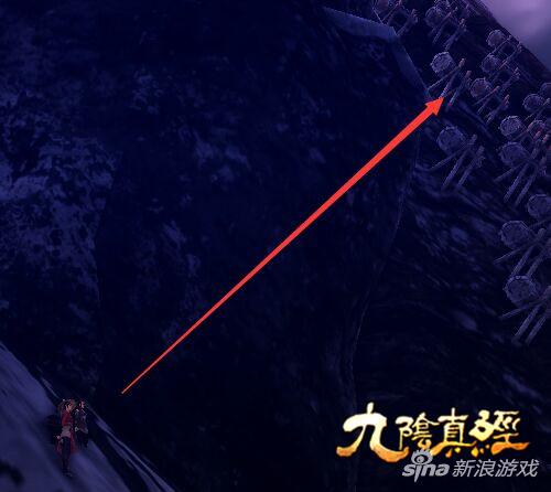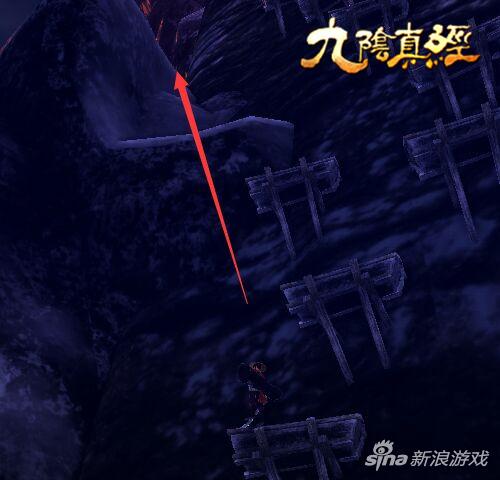 来到“棺崖”上后,继续调整视角,再次使用绝学跳往图示箭头所指的左边区域。