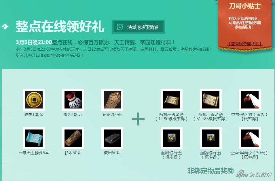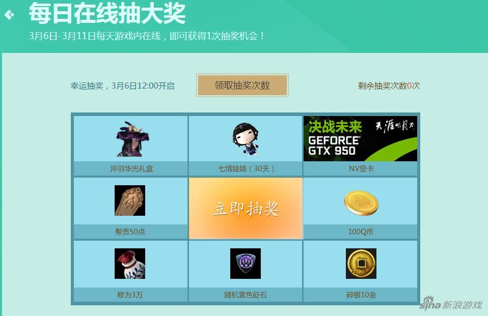 3月6日开始每日游戏在线都可以抽奖,活动地址://wuxia.qq.com/cp/a20160229zdzx/index.shtml