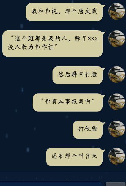 唐文武已经道歉,我也接受了,这件事情至始至终对于唐文武和叶晗二人都是背锅的,希望大家别去喷他们了,自己qq和其他的已经打码,还有关于校长和班主任,班主任对这件事情一直严肃处理,校长也是,而且昨天中午去完学校处理后校长还给我爸发短信让他多安慰我,希望大家还是别让无辜的人背锅。