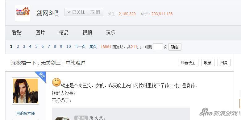 3月5日,剑网3游戏贴吧出现了一个标题为[深夜槽一下,无关剑三,单纯难过]的帖子,内容触目惊心。原来,楼主是安徽省黄山市某中学正在念高三的女生(现已转学),因为自己的性取向受到班上其他男同学的歧视,长期被欺负,他们出于恶作剧的目的,在楼主的饮料中下春药,并威胁还会继续下砒霜。