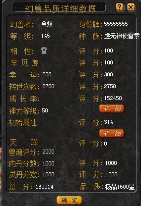 这只世界第一雷索的构成:雷属性100分+罕见度100分+300分的幸运+2750转世+152450成长评分+314的初始评分+2000分的兽魂+2000分的双丹=总分16014分,这高达1600星的星级,对于小记我这样的玩家真是可望而不可及的。下面我们一起看看各项成长跟初始属性,首先先给出官方的各项极限数据。