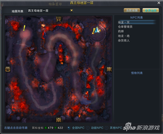 每天9:00-24:00都可以从狩猎场深处NPC-地龙·临(332,465)进入西王母地宫,让我们先来看看入口和第一层的地图。
