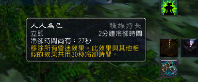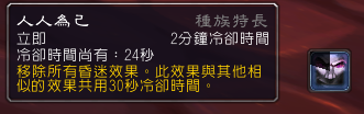 不过,自利和解除昏迷的技能不共享CD,只和徽章共享30秒CD,如果不改的话,依旧还是很好用的种族天赋技能。