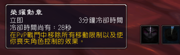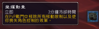 荣耀勋章:3分钟冷却,解除所有控制,必须进入一次战场或者竞技场才能解锁,如果不进入战场或者竞技场是无法使用荣耀徽章的,(进去就马上解锁,然后你不想打可以退队出战场或者竞技场)不管是否在PVP场景都不能使用,如果你点了PVP天赋T1的第一个斗士勋章,就会替代荣耀勋章,CD降为2分钟。