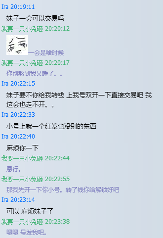 之后我上了她放红发的小号,看到信使里确实有红发。就放心的给她转了钱。