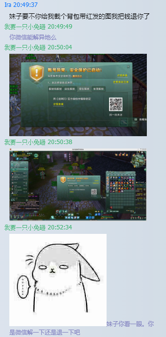 这时候骗子提到了:你给我截图背包,我退钱给你。我还天真的觉得这是要退钱辣。QQ她就不回了。然后我切到微信。