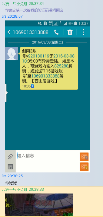第一张图是第一天,她说不方便上游戏,所以拖延到第二天也就是今天。现在想想幸亏她昨天不能交易,不然她如果不让我上号我还真的被骗没办法。