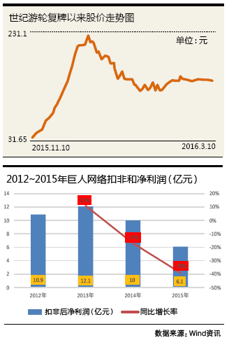 不过作为第二只回归的中概股,巨人网络受到A股市场热捧。被借壳的世纪游轮自11月复牌后连续拉了20个涨停板,股价从停牌前的31.6元飙涨至最高231.1元。但狂热过后就上演高台跳水,3月10日,世纪游轮收盘于118.3元,市值遭到腰斩。对于巨人网络而言,恰逢新产品青黄不接,移动端尚未开拓的困难之际,A股市场给予游戏公司的泡沫化估值,无疑正在将其从一家纯粹的游戏公司推向资本运作的彼岸。