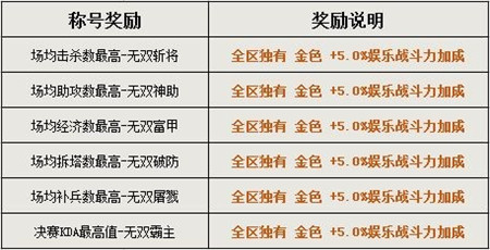 专属称号:无双杯全区独有专属荣耀称号会颁发给指定数据最高的选手,并且该称号的隐藏属性在赛后会被无双勇士所唤醒。全区独有无双金色专属荣耀称号,且佩戴该独有称号作战时战斗力可增加5%。