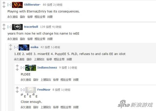 有玩家回复到:"和EE做队友是会变成这样的呀";"从此他要改名wEE了好吧";"EE wEE miserEE puppEE;PLD:劳资才不和你们这群EESB队形!"