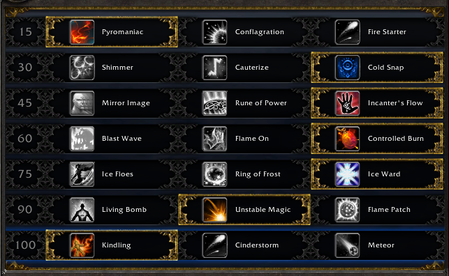 初始特质:凤凰代替炎爆。凤凰是瞬发伤害技能,45秒充能一层,累积3层。凤凰不消耗“炎爆术!”,凤凰充能耗尽后炎爆术恢复正常。