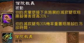 禅院教诲(被动):你的猛虎掌提高下一个幻灭踢或旭日东升踢的伤害30%,你的幻灭踢有30%几率重置旭日东升踢的冷却时间。