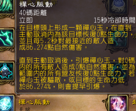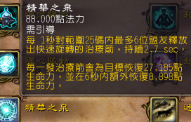 精华之泉:每秒治疗25码内的最多6个盟友,引导3秒。直接治疗90%110%SP,并在6秒内治疗60%36%SP。8%mana。