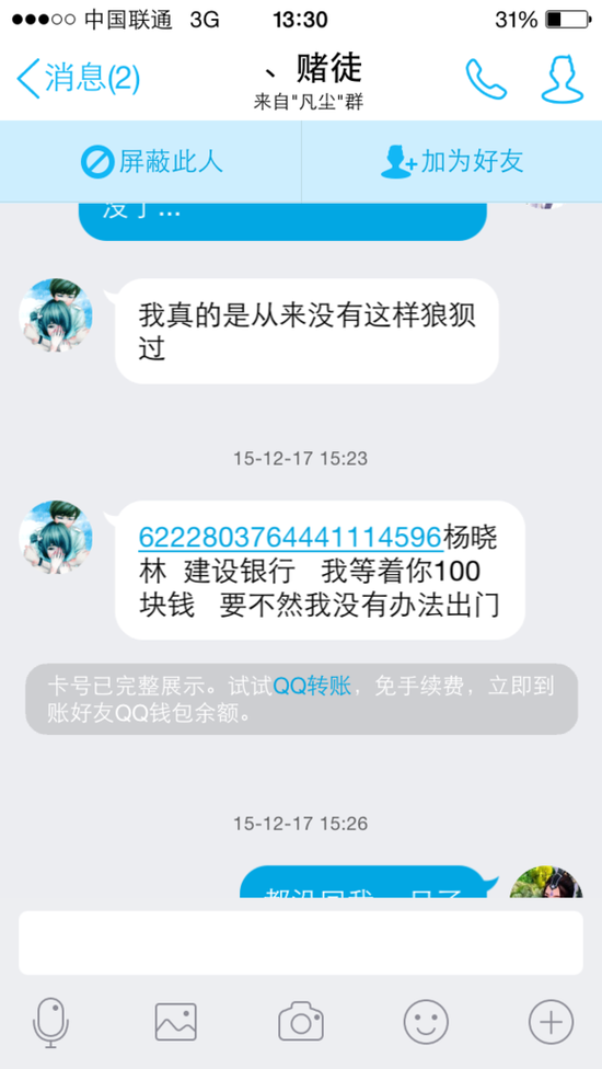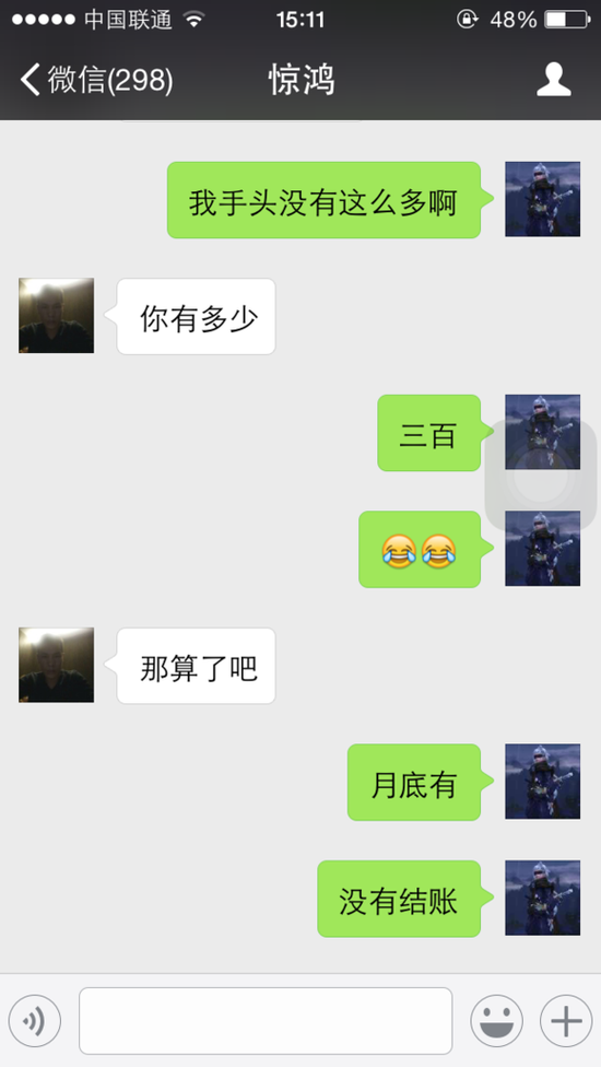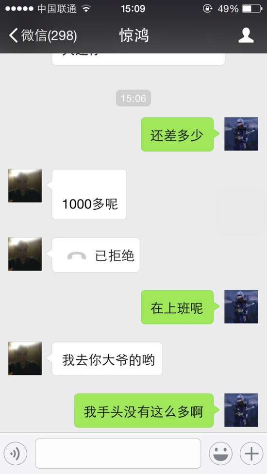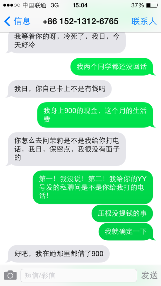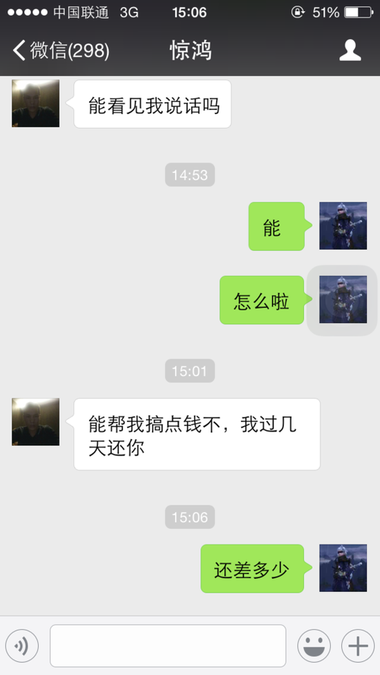 楼主作为学生,生活费有但不多,遂给了惊鸿500。平日里没金了他分一半给我,我没金了他把他身上的钱分一半给我,倒也正常,楼主木有想太多,而且一个人困难一时也算是正常,惊鸿又说就找几个玩的好的凑一下,楼主借就借了。