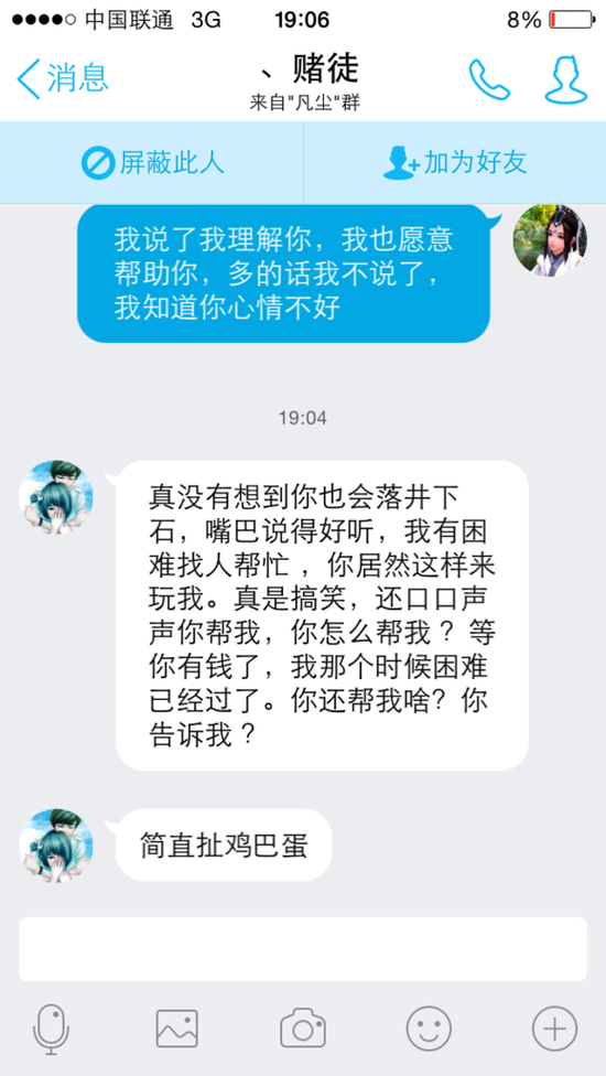 接着我拦下了那笔钱,却最终是整个事件整个矛盾的导火索,当我实话告知惊鸿我不会把情缘的钱给他的时候,他翻脸了!没错你没看错,2年的剑三路一路走来,为了1000块翻脸了,下面是对话截图,大家能品味我的心情么?
