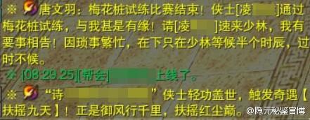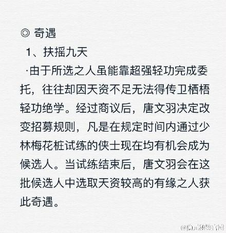今 天是扶摇九天奇遇改版后的第一次全区服CD。在实测中,活动中跳入42秒玩家可获得触发扶摇九天资格,目前采样数据最低触发玩家资历为2W3,其他条件因 为样本少未统计,欢迎补充。但活动中出现疑似BUG,唐文羽喊话可获得成就玩家,对话唐文羽无法获得奇遇,而是其他玩家可领取获得。