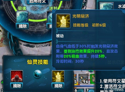 3。单刷中高级逐鹿小怪符文:惊涛破(献祭)、雨落黄泉(强力)、天地无极(冷却)、困心(冰封)、水凌波(吸魂),此外,还要带上仙灵的技能光明悬济和皇极天化。在自身血量低于30%后,会出光明悬济,用困心(冰封),这样就会输出吸血,最后再来个水凌波(吸魂)秒掉怪物,满血OK