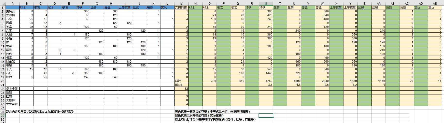 3。 当你把上面说的家具(除了有稀缺材料的)摆进房子之后,总体风水值离250也差不了多少了,所以此时把有稀缺材料的家具各做一个即可(不用考虑风水)。
