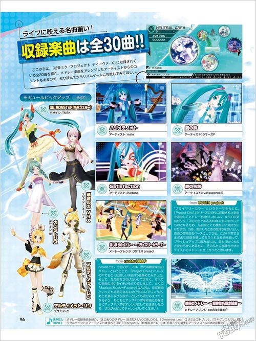本作全部收录了初音系列的30首曲目,全部的曲目在之前就为大家总结好了,包括普通歌曲,属性分类及串烧歌曲等等,欢迎点击这里查看由电玩巴士的yamato37为大家汇总的全部介绍。同时还有本作总计约300种的服装服饰的介绍,也欢迎大家点击这里进行查看。