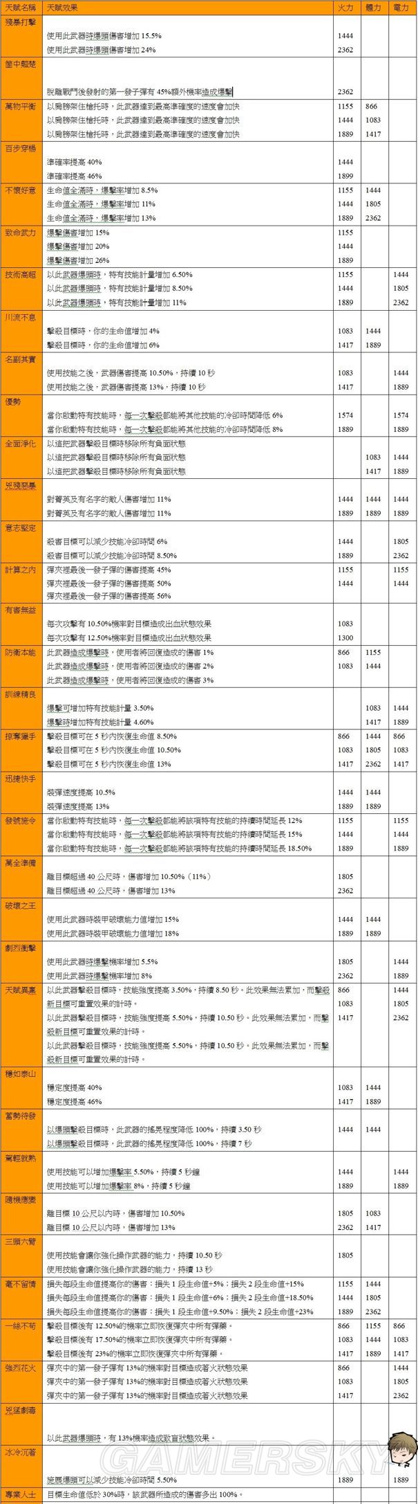 天赋效果、火力、体力、电力表格内由上至下是蓝、紫、金