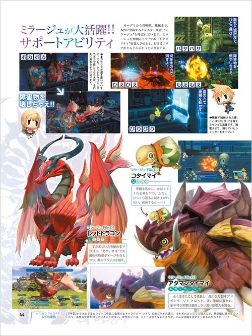 莫古利、召唤兽、机械等本作中登场的怪兽都被称为“幻影”,让幻影成为伙伴可以习得“辅助技能”使可以探索的领域逐渐扩大。这里还介绍了创世兵器、利维亚桑等几只新确认登场的幻影。