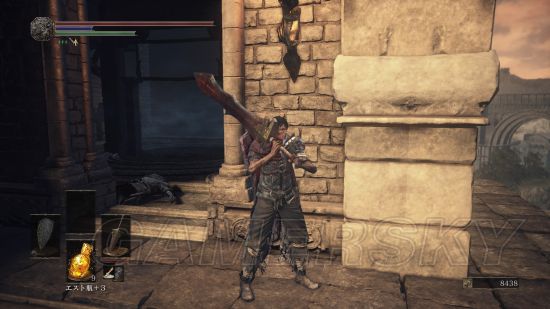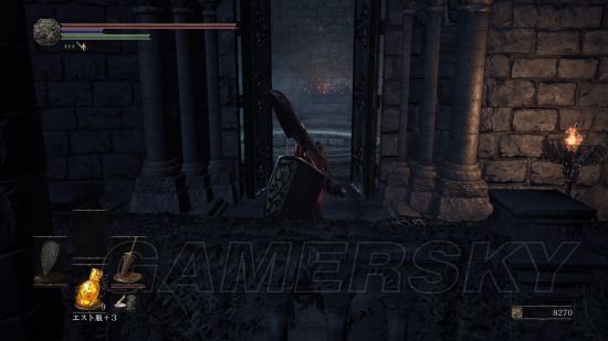 然后一路走下去,干掉个大剑骑士后,从他旁边的房梁跳下去