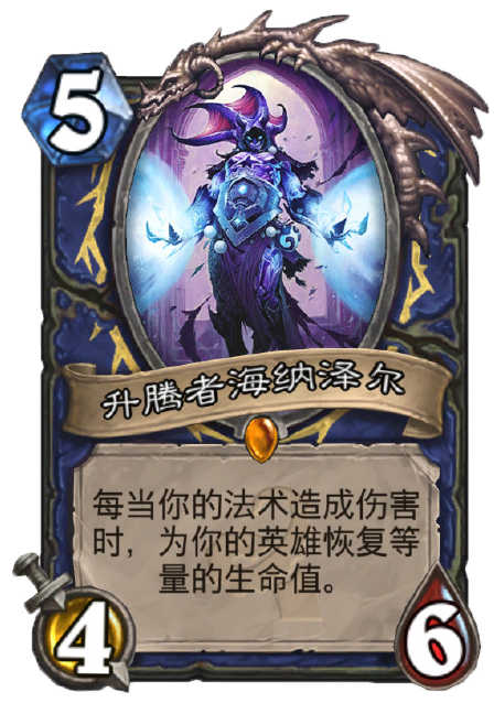 升腾者海纳泽尔:每当你的法术造成伤害是,为你的英雄回复等量生命值。萨满职业橙,5费46不亏身材,法术造成伤害回血,真正的又奶又输出。