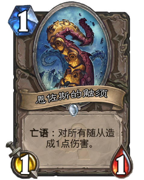 佐恩斯的触须:亡语对所有随从造成1点伤害。中立卡,1费版本的自爆绵羊,从全场AOE的效果来看,可以很好的对付低费铺场卡组。